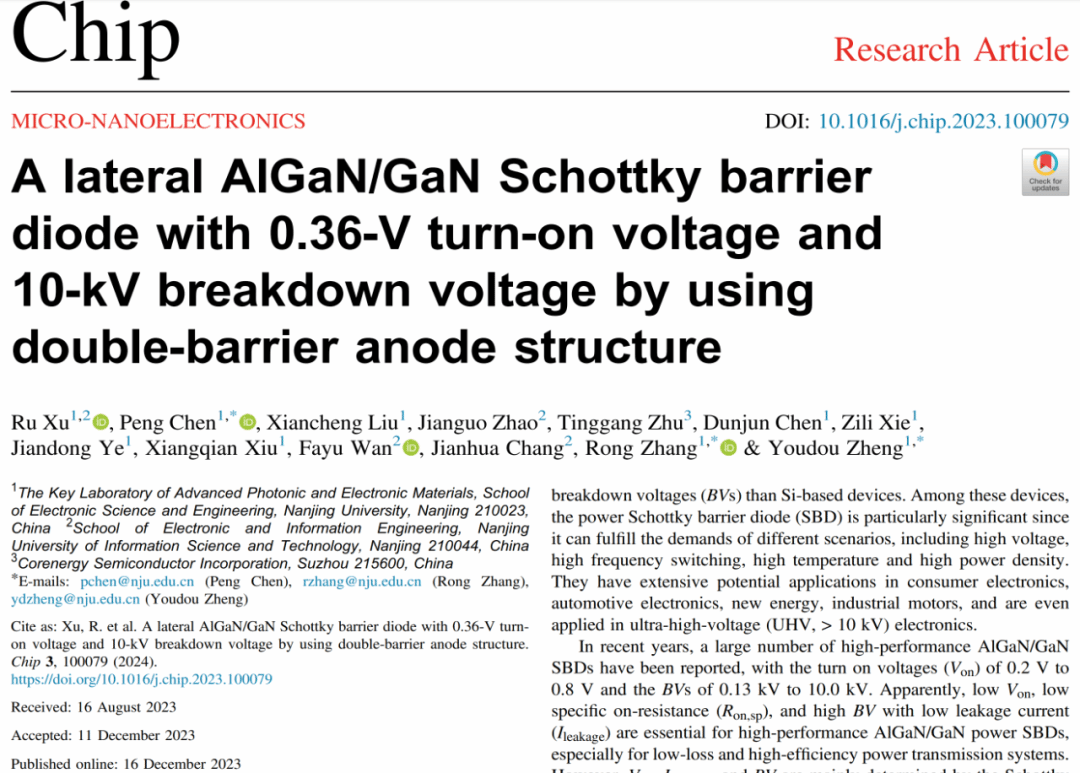 Recently, the team of Professor Chen Peng and Zhang Rong from School of Electronic Science and Engineering published a research paper, titled A Lateral AlGaN/GaN Schottky barrier diode with 0.36 V turn-on voltage and 10 kV breakdown voltage by using double barrier anode structure, on the Journal Chip. The research achieved a lateral AlGaN/GaN Schottky barrier diode with a 0.36 V turn-on voltage and a 10 kV breakdown voltage by employing a double barrier anode structure. Dr. Xu Ru is the first author, and the corresponding authors are Prof. Chen Peng, Prof. Zhang Rong, and Prof. Zheng Youdou. (//doi.org/10.1016/j.chip.2023.100079)